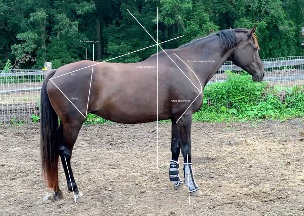 Pegasus has correct conformation, with a strong foundation, great feet, and a long frame. She has a medium-set neck, good pillar of support, long, somewhat straight shoulders, steep-angled humerus, equal alignment between her ilium and femur sides, average stifle placement, and fair alignment between her point of hip and the lumbosacral gap. Points to correct include less angle to her hocks, more slope to her shoulder, and less angle in her lumbosacral alignment.