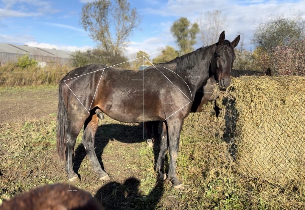Though still growing, Romeo has correct conformation, with a strong foundation, uphill build, and a strong topline. He has a high-set neck, good pillar of support, long sloping shoulders, steep-angled humerus, equal alignment between his ilium and femur sides, medium stifle placement, and very good alignment between his point of hip and the lumbosacral gap.